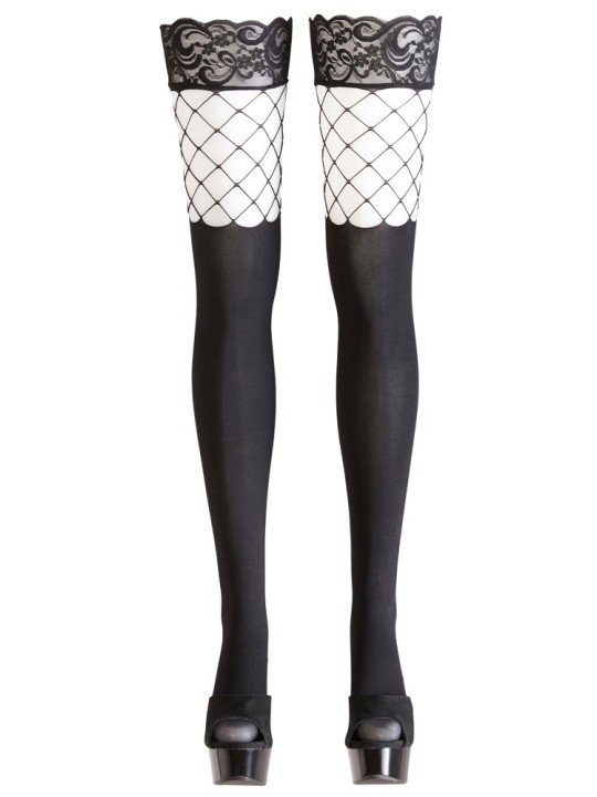 Splendide calze autoreggenti nere. Stupirete il vostro partner con queste calze che si presentano opache velate dal piede fino al ginocchio, per poi divenire a rete e terminare con una splendida balza in pizzo. Effetto 2 in 1.... • Materiale: 92% poliammide, 8% elastan.